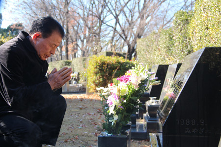 東京都世田谷区で宮沢みきおさん=当時(44)=一家4人が殺害された事件は30日、未解決のまま発生から25年となった。写真は、墓前で手を合わせる警視庁成城署の元署長土田猛さん=同日午前、埼玉県新座市 【時事通信社】