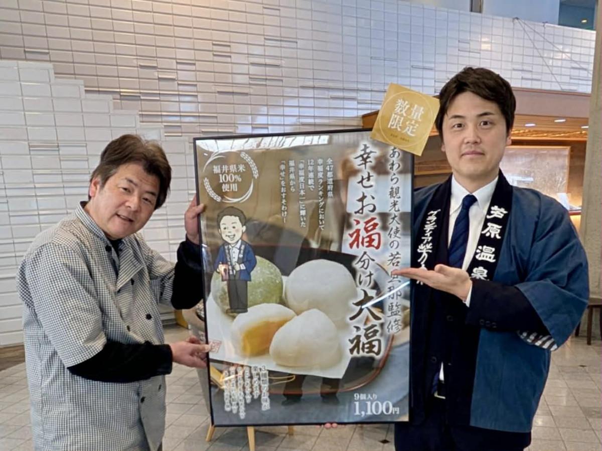 あわら市の温泉旅館「グランディア芳泉」(舟津)が2月3日、新商品「幸せのお福わけ大福」の販売を始めた。