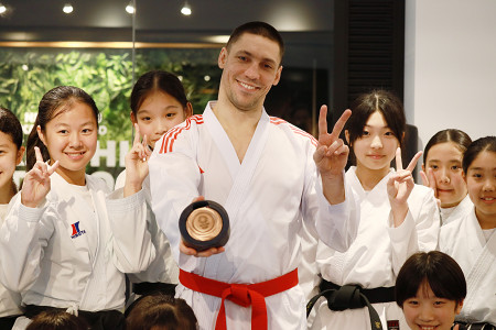 2021年東京五輪の空手男子組手75キロ級でウクライナのスタニスラフ・ホルナさんが獲得し、戦渦の母国を支援するため競売にかけた銅メダルが5日、無償で本人に返還された。日本人落札者の申し出で実現=都内 【時事通信社】