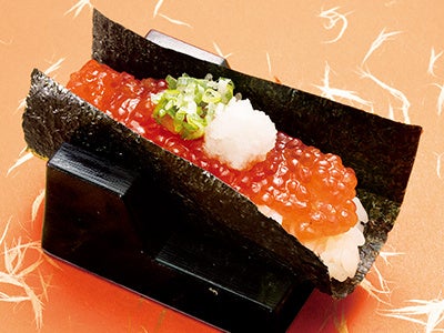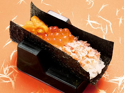 さらに、新作「姫つつみ」シリーズも登場!「姫つつみ」は鮮やかな魚介類を美しい着物のように華やかに盛り付けた、二口サイズの可愛らしい海苔包みのお寿司です。厳選された海苔のパリッとした食感と豊かな磯の香りが、素材の旨みを包み込みます。また、お客様が手に取ってお召し上がりいただきやすいよう、この「姫つつみ」シリーズの為にご用意した木台にのせてご提供いたします。