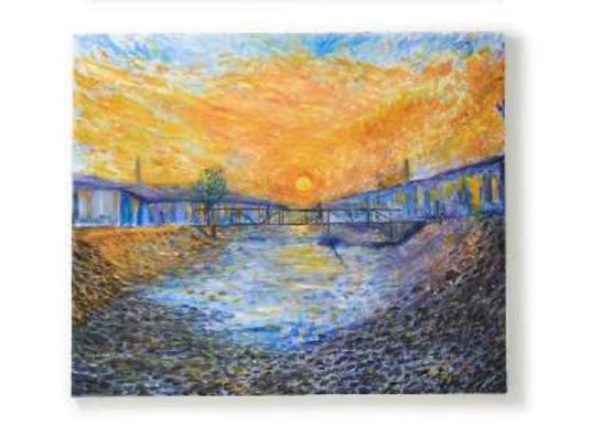 印象派描画方法を取り入れた、これまでの作風とは違った作品です。印象派の描画方法であれば使用を避ける黒色をあえて使うことで、奥に描かれるかつてのアグボグブロシーの綺麗な川と、手前に黒を使って描かれた電子廃棄物に覆われた現在の川の対比を強調させています。