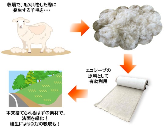 動物繊維製土壌流出防止工「エコシープ」頻発する豪雨災害などにより侵食を受けやすい土壌や、乾燥等による植生不良の懸念がある法面に。