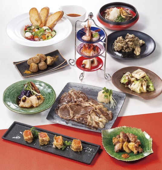 きめ細かな肉質と上品な甘みが特長のブランド牛「若狭牛」をはじめ、ほどよく脂がのった上質な味わいの「ふくいサーモン」、身が厚く豊かな香りと味わいの「九頭竜まいたけ」、10~12月に旬を迎える福井県大野市上庄地区の特産「上庄さといも」などを使用した、全10品をお楽しみいただけます。