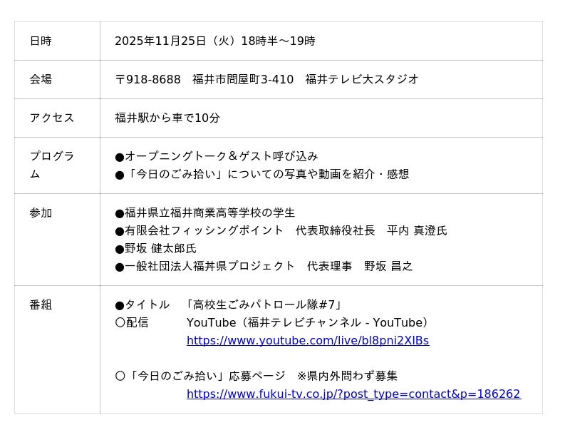 一般社団法人福丼県プロジェクトは、11月25日(火)に「高校生ごみパトロール隊」生配信の7回目を放送いたします。この生配信は、日本財団が推進する海洋ごみ対策プロジェクト「海と日本プロジェクト・CHANGE FOR THE BLUE」の一環で開催するものです。