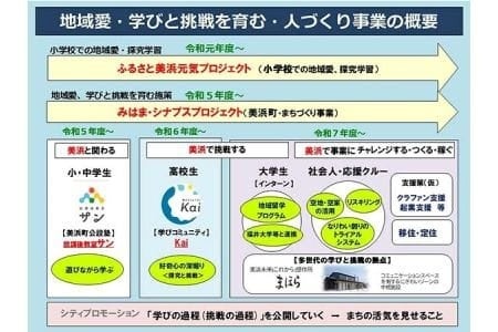 「みはまシナプスプロジェクト」は、町の未来を担う子どもたちの〈学び〉と〈挑戦〉を町全体で支える事業です。少子高齢化や若者流出といった課題を、学びと挑戦の機会に転換し、町・住民・企業が連携して推進しています。スローガン「学びを挑戦のエンジンに!」のもと、子どもたちの興味を引き出し、「やってみたい」という挑戦を実現する機会をつくる「人づくり」を核としています。現在、小中学生を対象とした公設塾「放課後教室サン」と高校生対象の「学びコミュニティーKai」を設立し、活動を展開しています。まち全体で子どもたちの成長を支え、まちの未来に希望と愛着を抱くことをゴールとします。なお、今後は、大学生や社会人を対象としたインターンシッププログラムも展開予定です。
