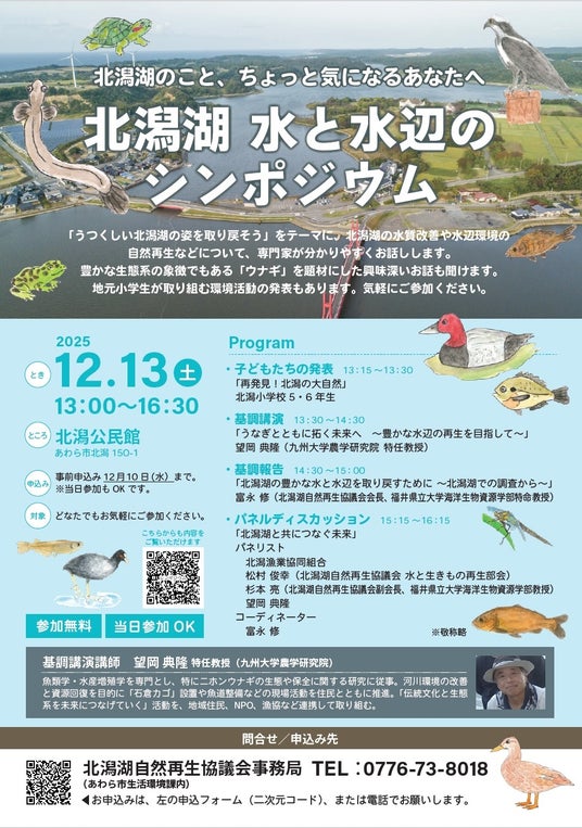 北潟湖自然再生協議会(事務局:あわら市生活環境課)は、令和7年12月13日(土)、北潟公民館にて「北潟湖 水と水辺のシンポジウム~うつくしい北潟湖の姿を取り戻そう~」を開催します。
