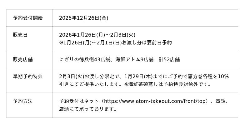「にぎりの徳兵衛」「海鮮アトム」の2026年「福を呼ぶ 恵方巻」のご予約開始!今年は早期予約特典も!