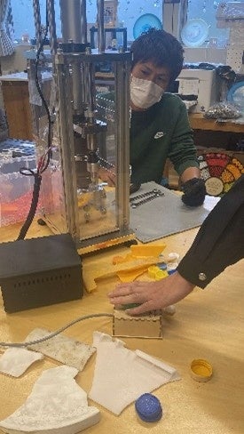 トンカンテラスでは、海洋プラスチックをアップサイクルした商品を開発・販売しています。今回はトンカンテラスの協力で、回収したごみの一部を活用し、洗浄→粉砕→成形の過程を経て、環境にやさしいトイレサインを製作しました。漂着ごみは、劣化していたり、塩分などが付着していたりとリサイクルはかなり難しいそうです。