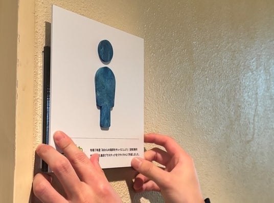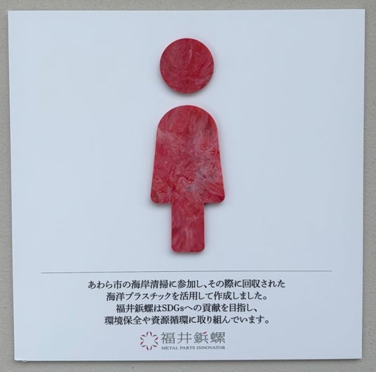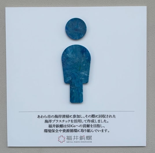 あわら市では、地域環境の保全を目的に海岸清掃を行っています。昨年より、サーキュラーエコノミーへの挑戦として、回収した海洋プラスチックを使用してトイレサインを作っています。今年度も、昨年10月26日(日)に実施した「あわらの海岸をキレイにしよう」で回収した海岸プラごみを用いてトイレサインを新たに設置。昨年に引き続きイベント参加者の福井鋲螺株式会社に協賛いただき、製作したトイレサインを2月2日(月)にハピラインふくい細呂木駅のトイレと市役所のトイレに設置しました。