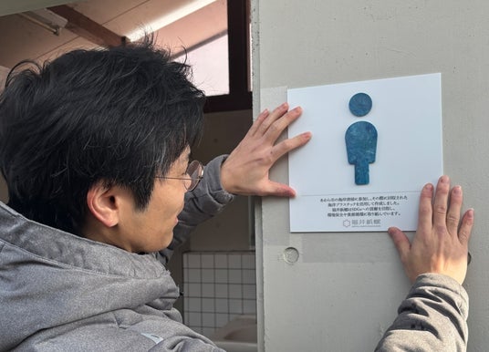 製作したトイレサインを公共施設に設置し、多くの人の目に触れることで、海ごみの現状や“使う責任”について考えるきっかけにしたいと考えています。なお、この取り組みに賛同していただき、協賛していただいた福井鋲螺株式会社と一緒に設置を行いました。